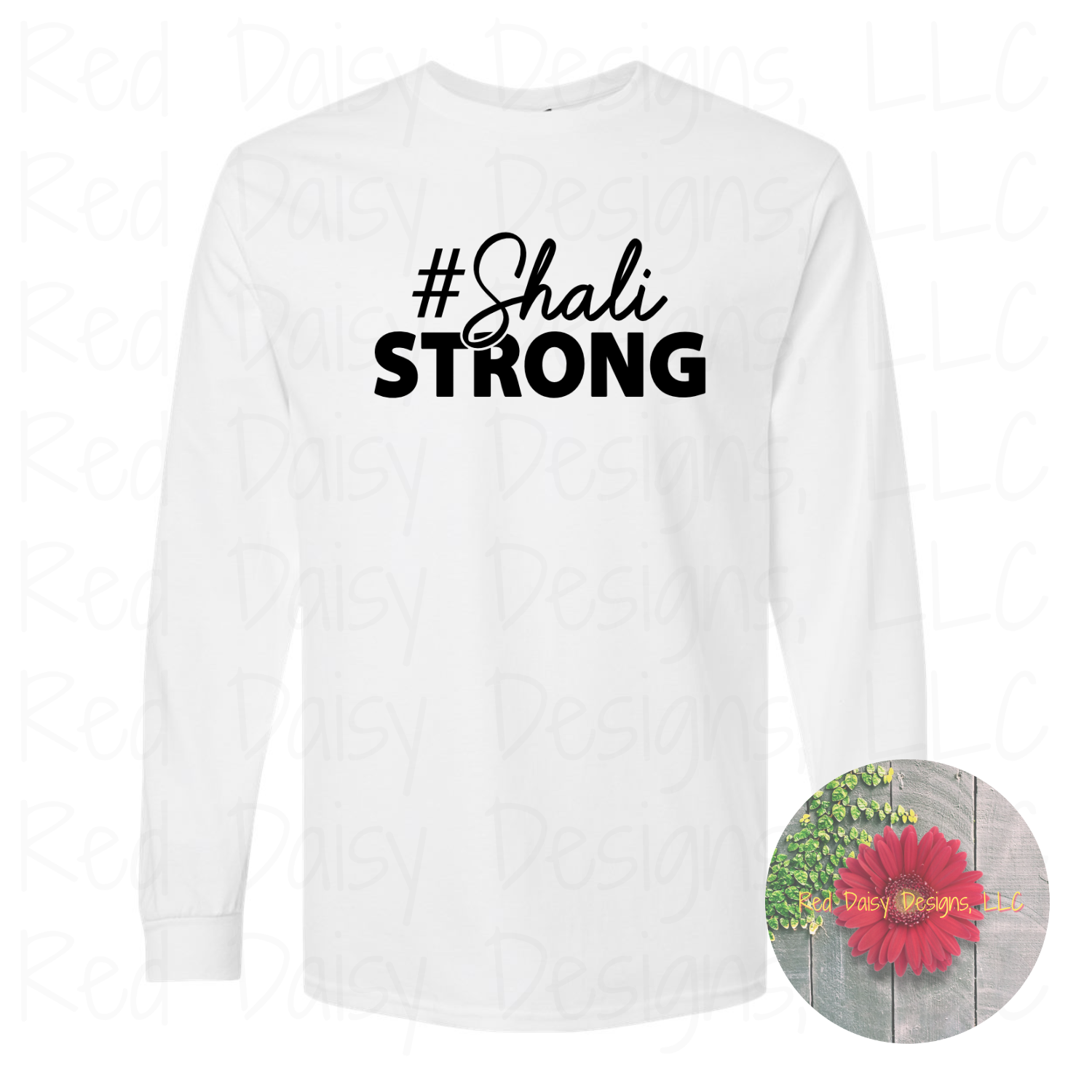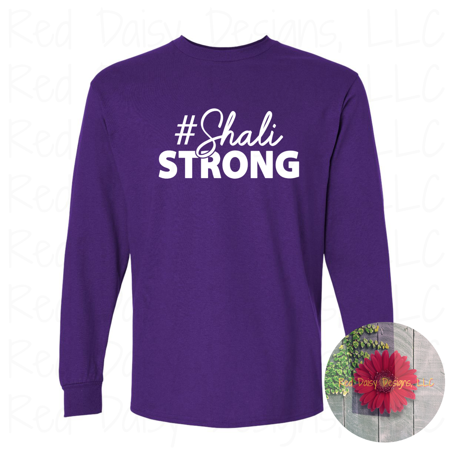 Wear your support and make a difference with our #ShaliSTRONG long sleeve shirt. Designed to represent strength, love, and community, this shirt is perfect for everyday wear while supporting a meaningful cause.